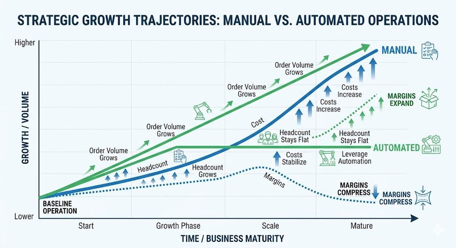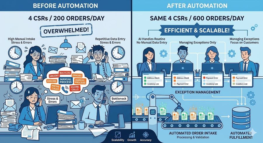 The standard response to growing order volume is hiring. Another CSR, then another, then a supervisor to manage the growing team. Each hire adds capacity, but also adds cost, training time, and organizational complexity. At some point, the margin per order starts shrinking even as revenue grows.